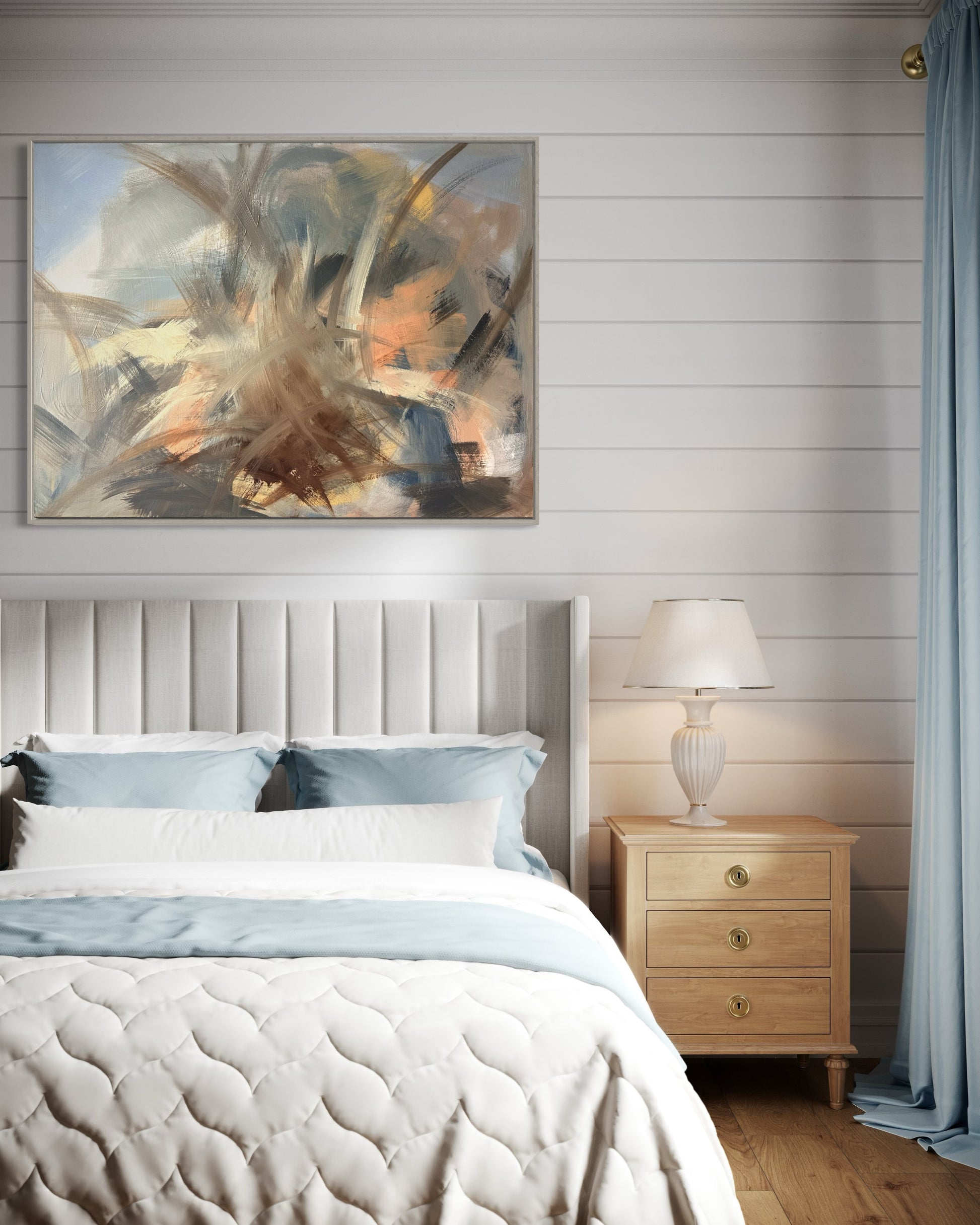 Experience a soothing effect with Composition#8. The soft neutral colors and aqua palette create a peaceful atmosphere in any space. Relax and unwind with this perfect combination of colors, carefully designed to bring a sense of calmness to your surroundings.