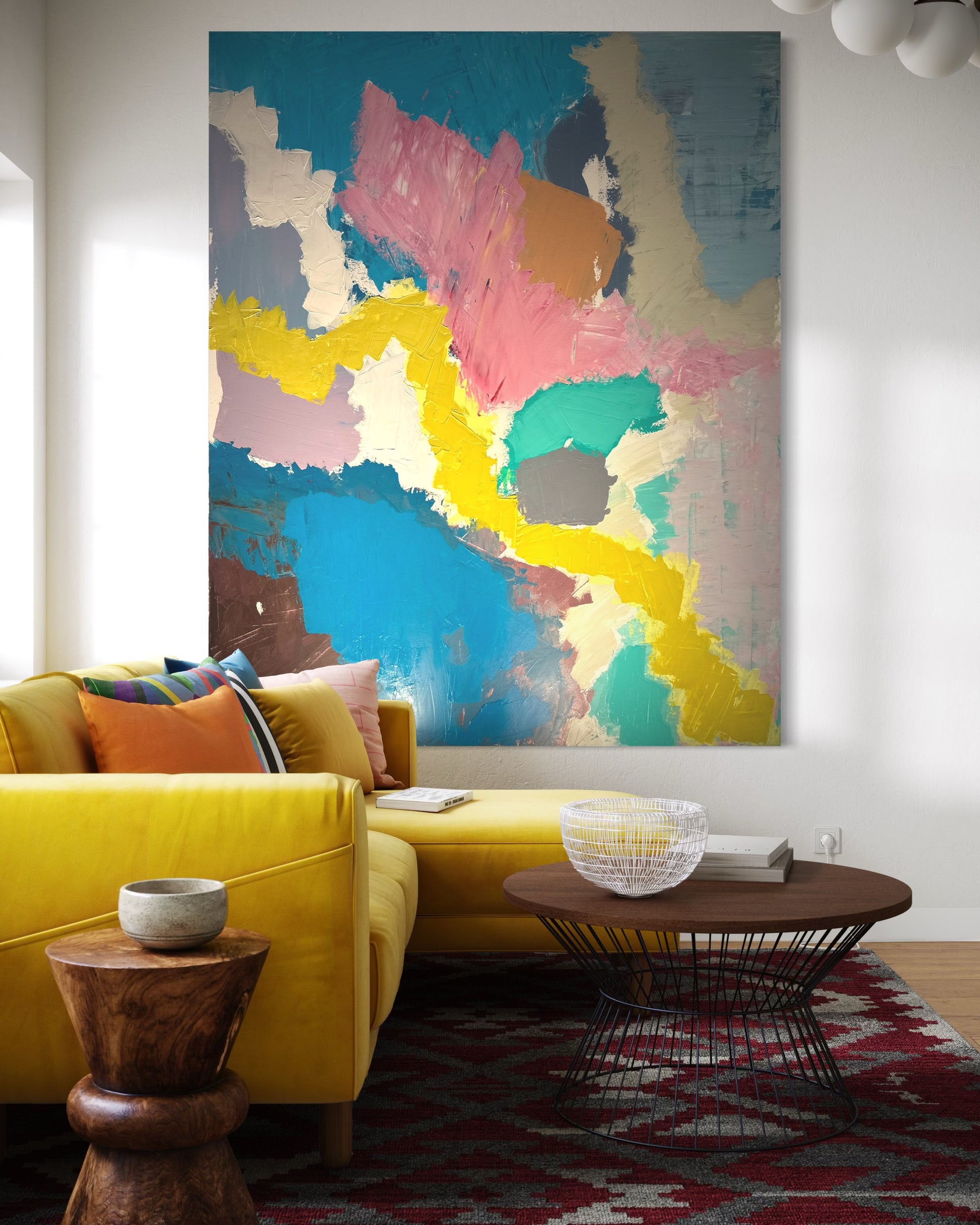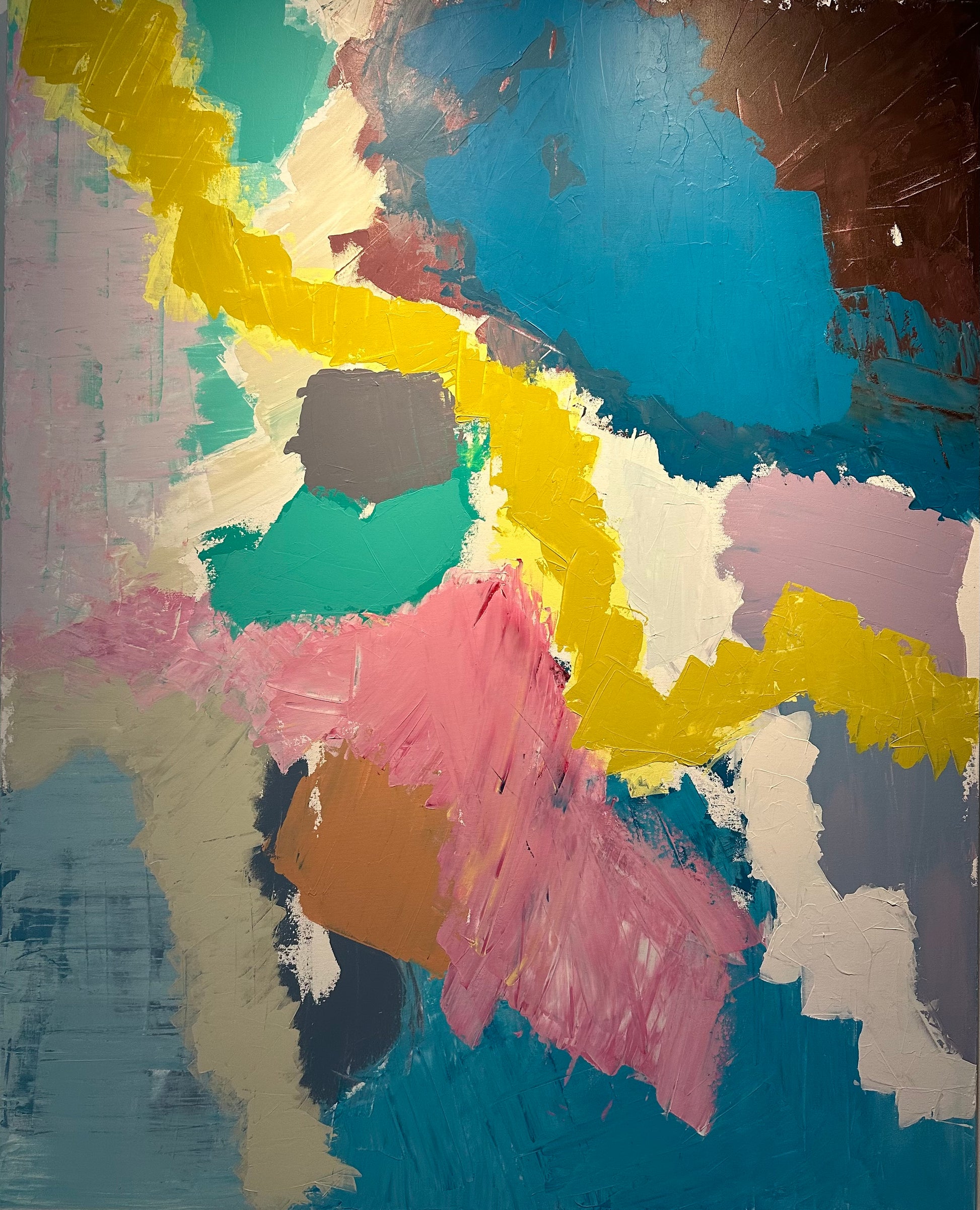 This abstract painting radiates the joy and clarity of a sunlit morning in the Italian Alps, brought to life through a luminous palette of teal, pinks, and lemon yellow.