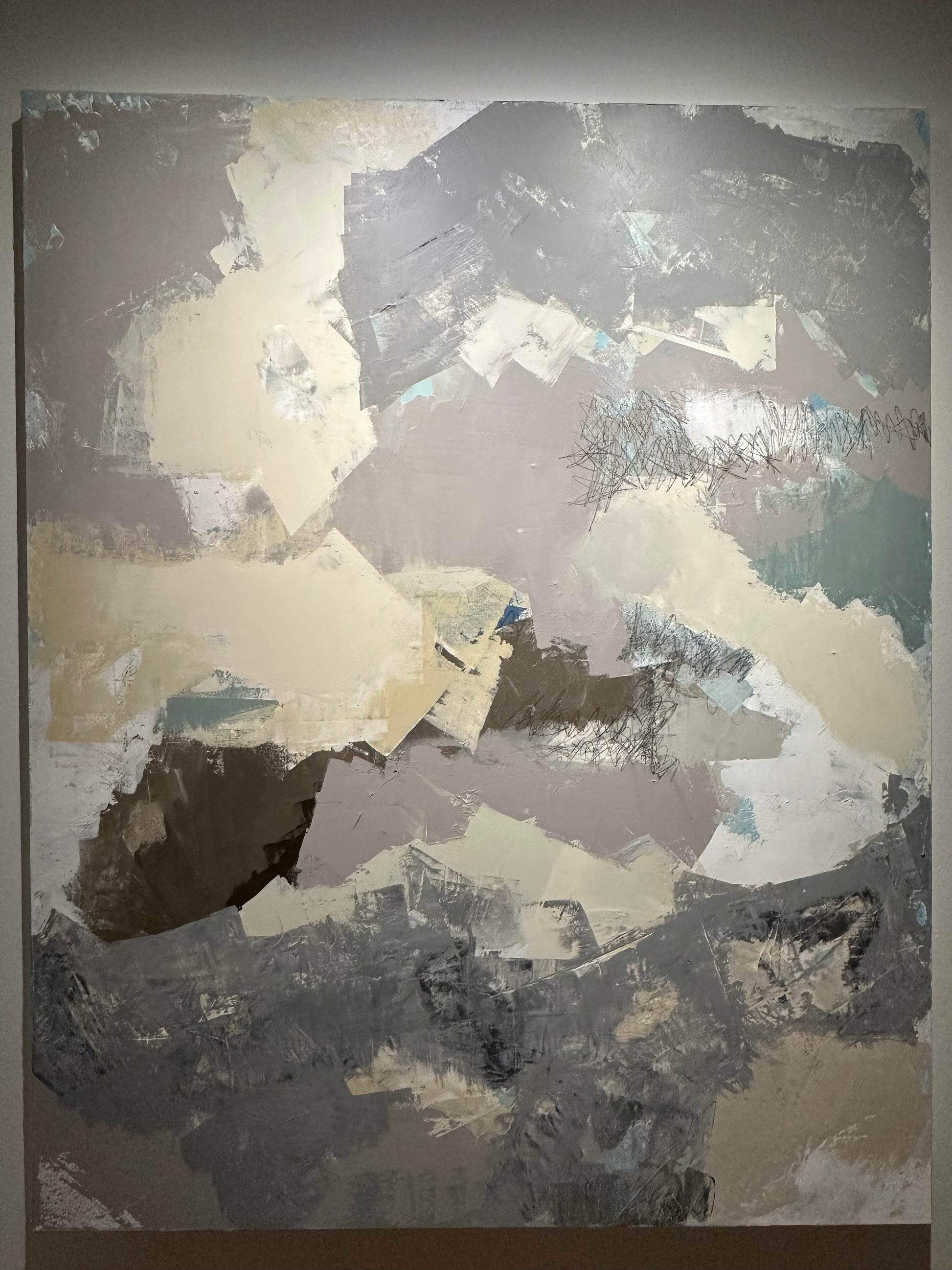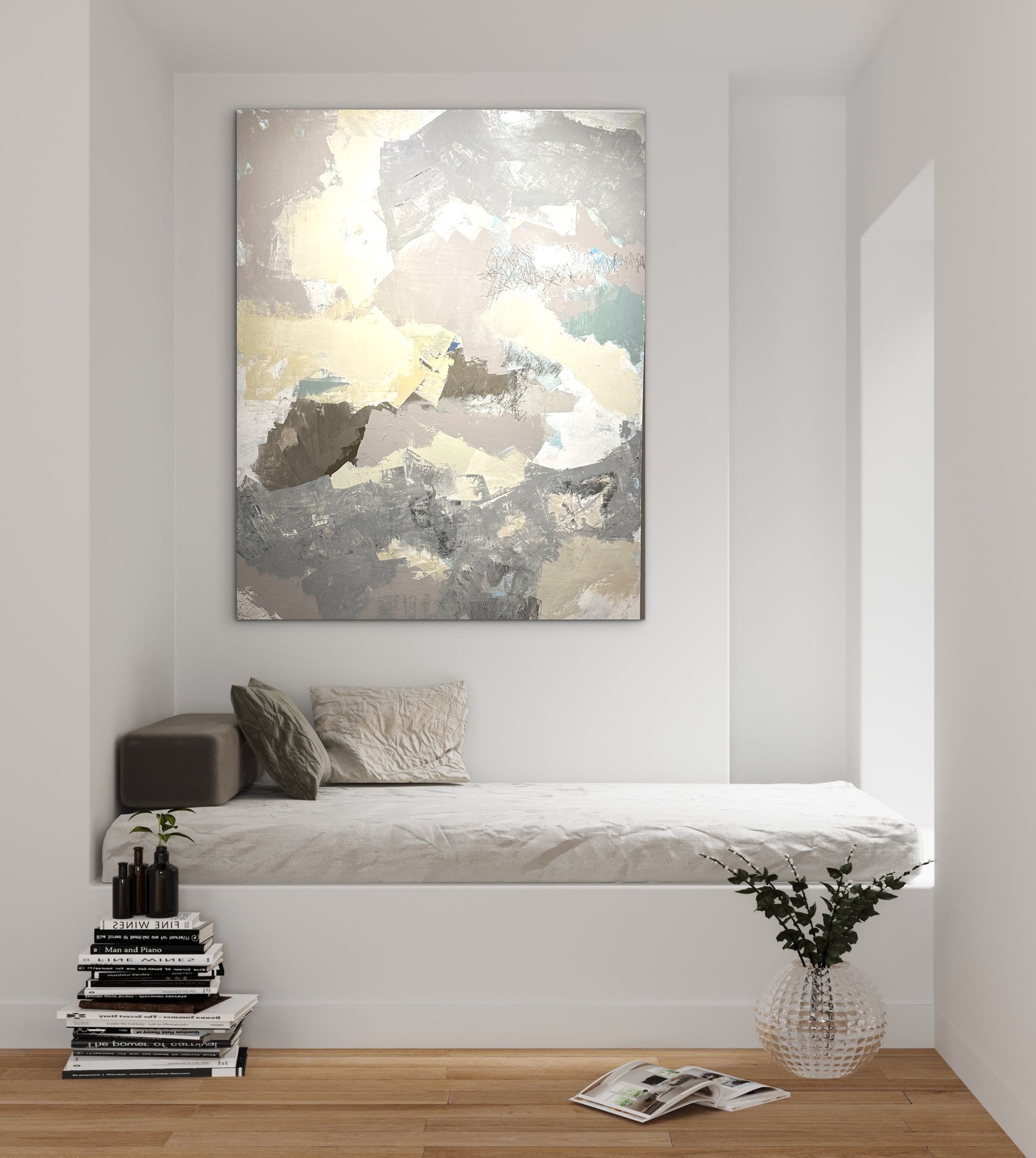 In this piece, color whispers instead of shouting. Soft taupes, muted creams, and gentle grey-washed tones drift across the canvas like quiet thoughts settling into place. The shapes feel organic, almost dissolving at the edges, creating a sense of calm movement. Nothing competes; each hue rests in harmony, revealing how even the faintest colors can shift the entire mood of a space.